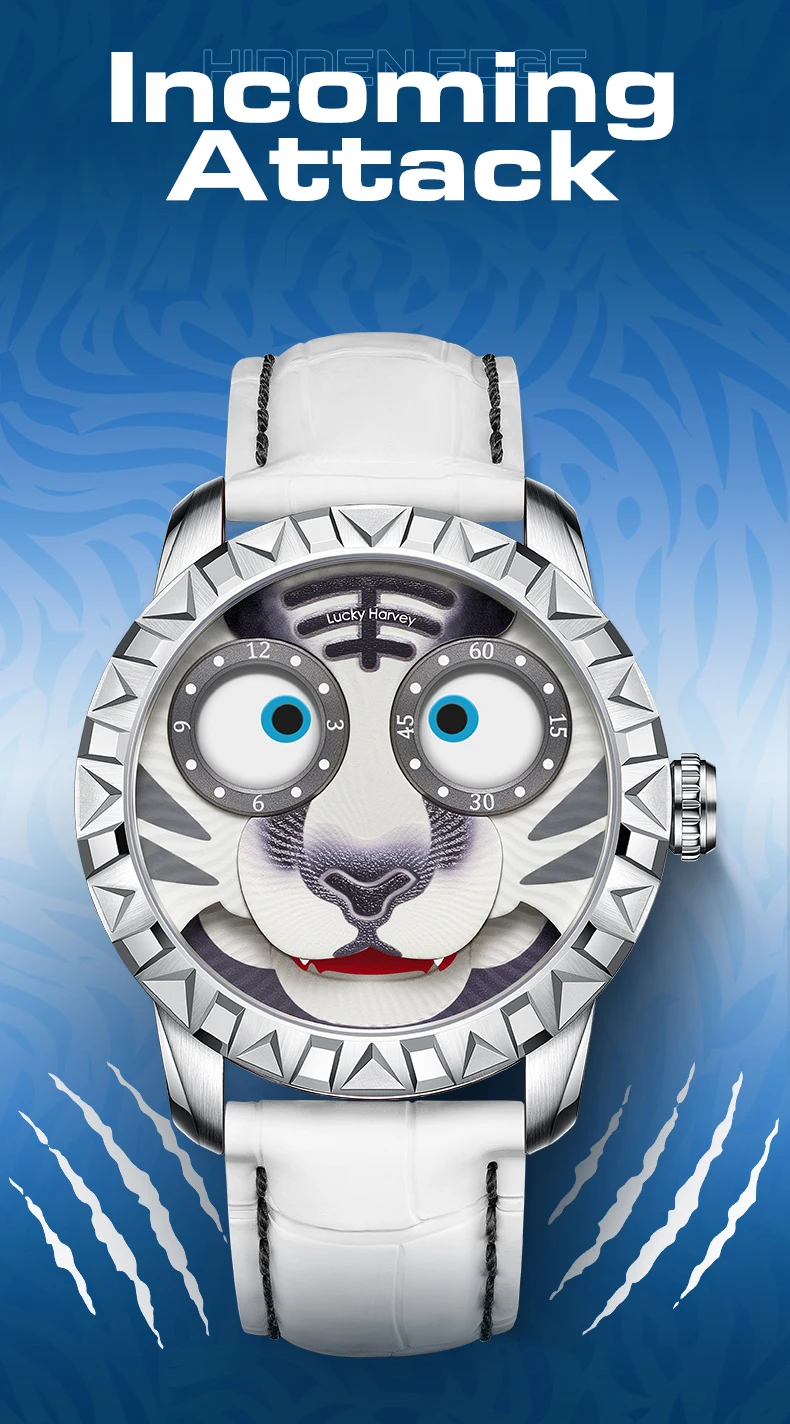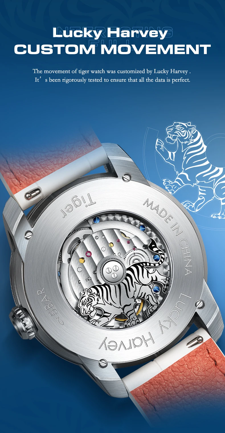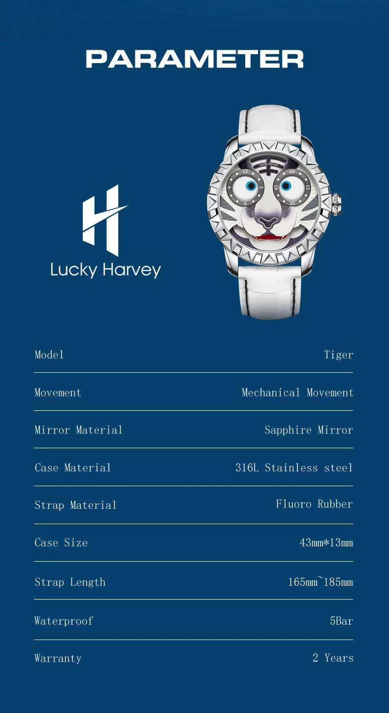 Beau Montre mécanique homme ,la Lucky Harvey LH001 est une montre mécanique pour hommes qui allie puissance et raffinement. Son cadran unique orné d’un tigre lumineux incarne force et élégance, tandis que son boîtier en acier inoxydable 316L de 43 mm et son verre saphir assurent robustesse et résistance aux rayures. Dotée d’un mouvement automatique LH001 avec une fréquence de 28 800 vibrations/heure, elle garantit une précision remarquable et une réserve de marche de 40 heures. Étanche jusqu’à 5 ATM, cette montre est adaptée à un usage quotidien et aux activités sportives légères.