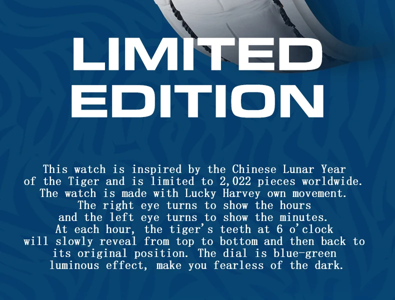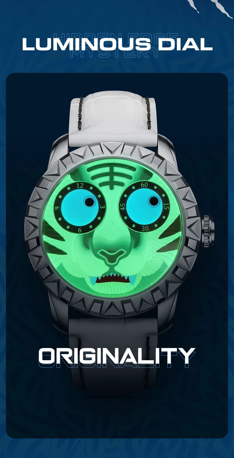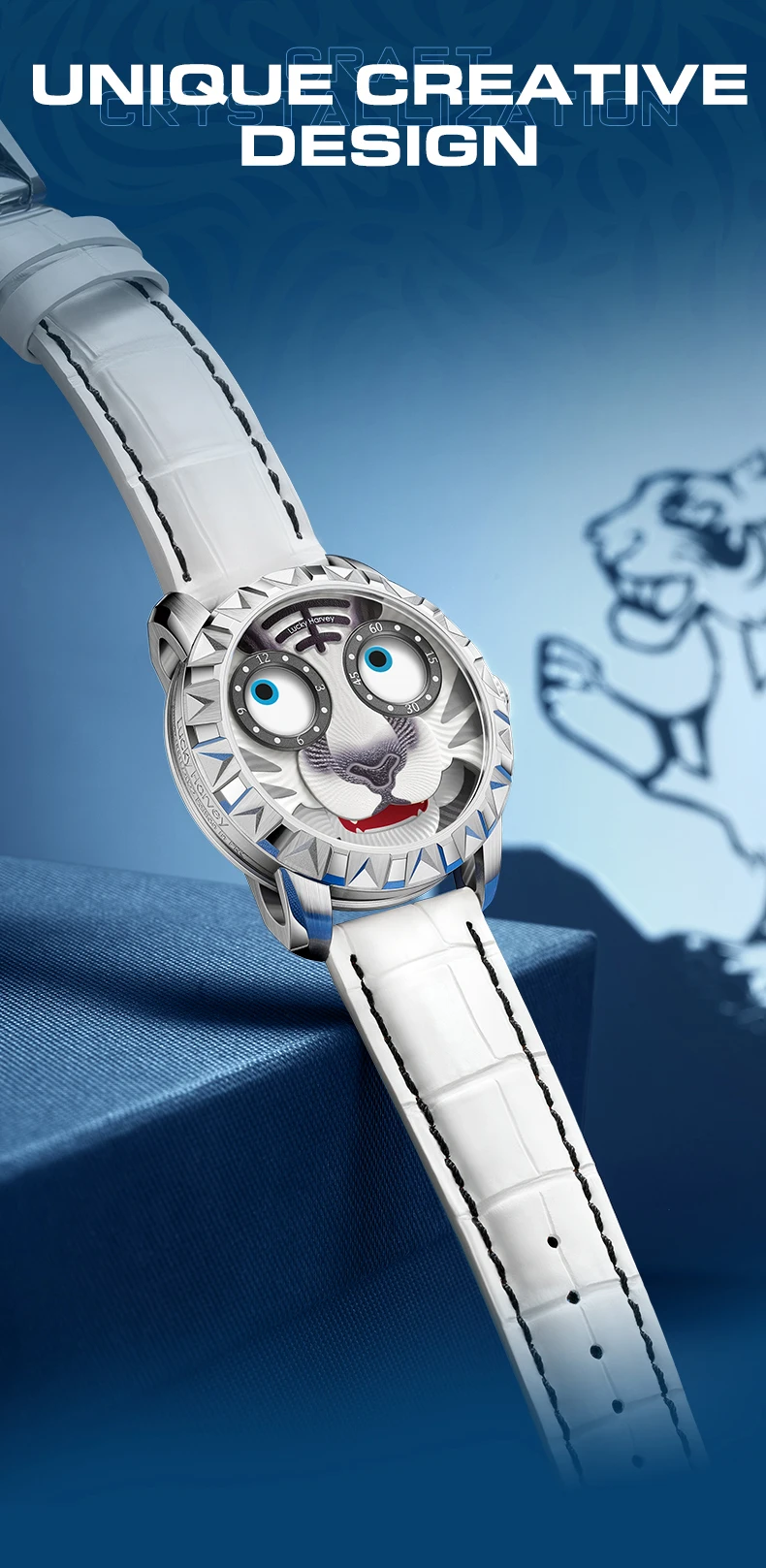 Beau Montre mécanique homme ,la Lucky Harvey LH001 est une montre mécanique pour hommes qui allie puissance et raffinement. Son cadran unique orné d’un tigre lumineux incarne force et élégance, tandis que son boîtier en acier inoxydable 316L de 43 mm et son verre saphir assurent robustesse et résistance aux rayures. Dotée d’un mouvement automatique LH001 avec une fréquence de 28 800 vibrations/heure, elle garantit une précision remarquable et une réserve de marche de 40 heures. Étanche jusqu’à 5 ATM, cette montre est adaptée à un usage quotidien et aux activités sportives légères.