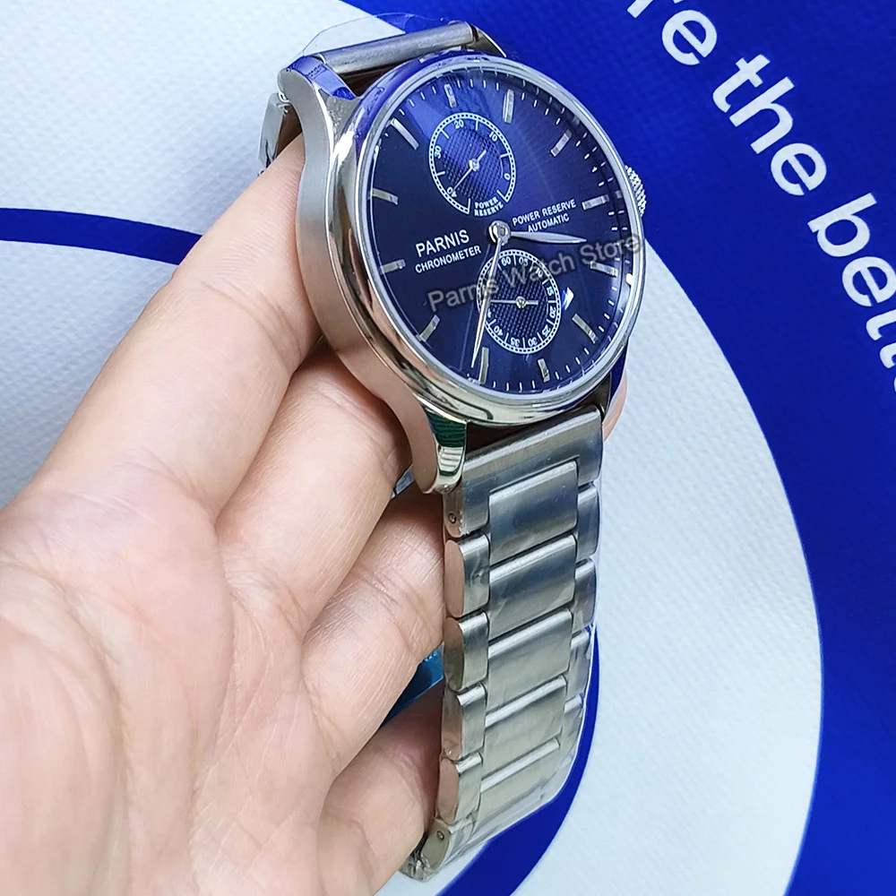 Montre-bracelet Parnis 42,5 mm avec réserve de marche et cadran bleu, mouvement automatique ST2542 pour homme.