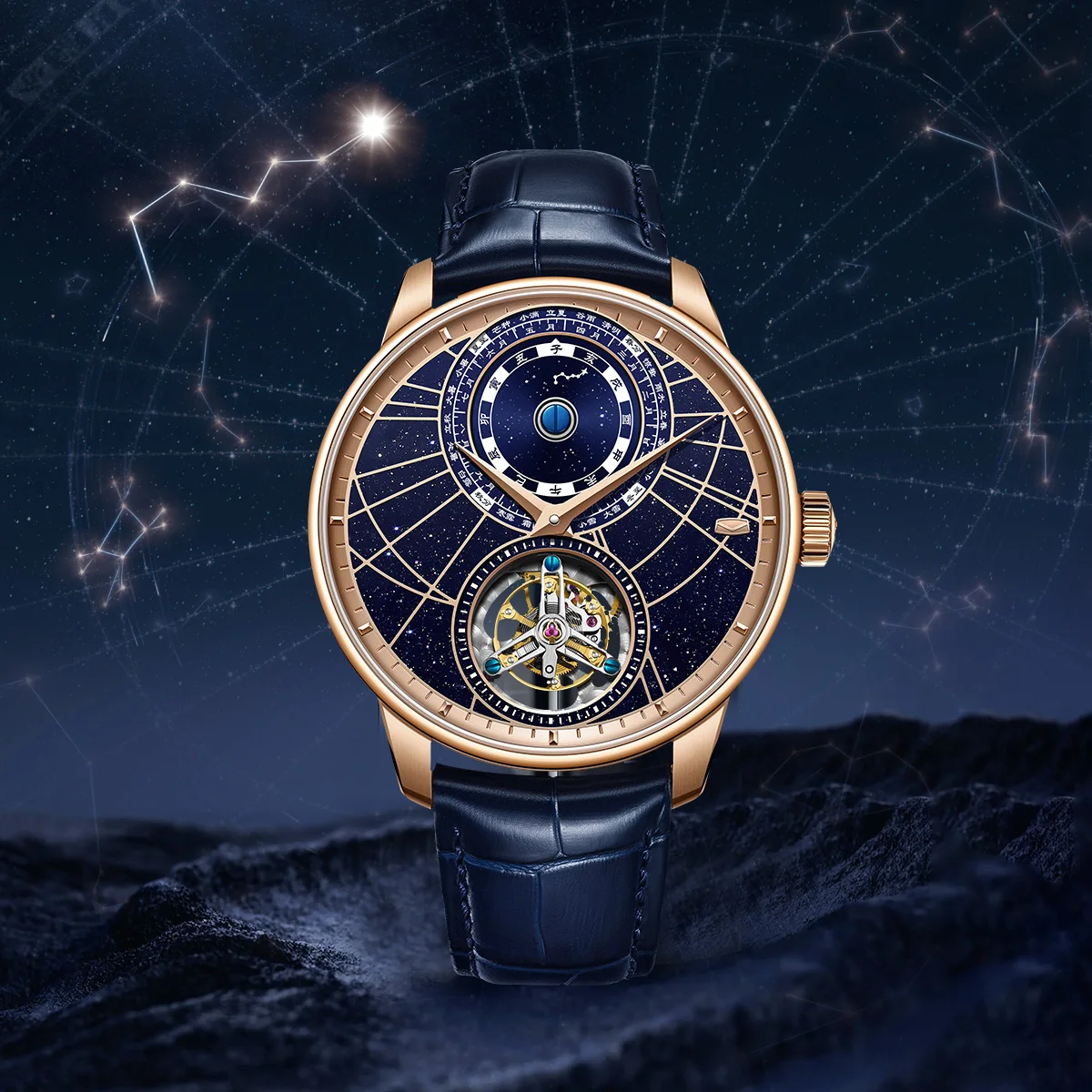 Montre Sea-Gull Master Series Tourbillon homme – Luxe, cadran ciel étoilé, calendrier astronomique chinois, boîtier plaqué or rose 316L, verre saphir