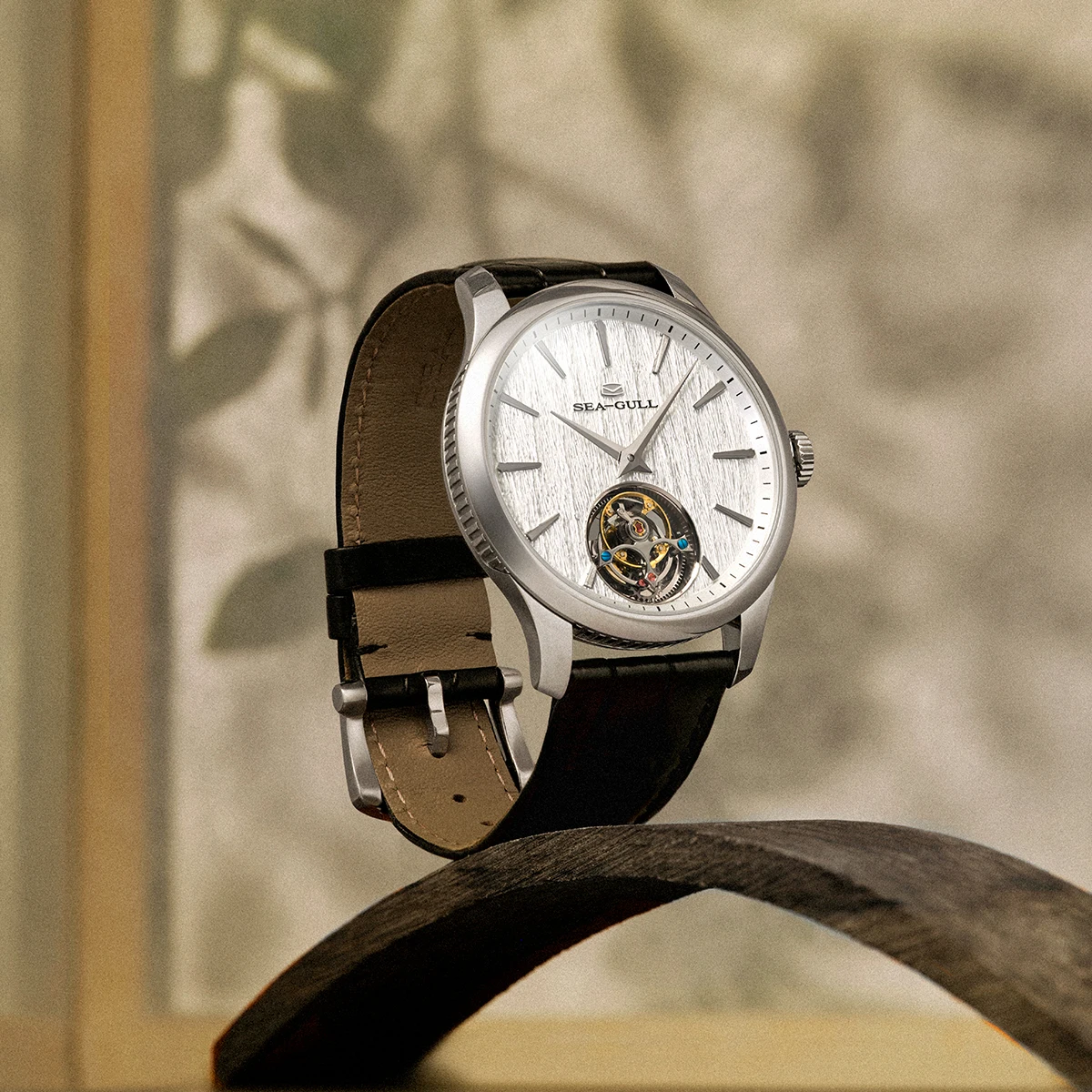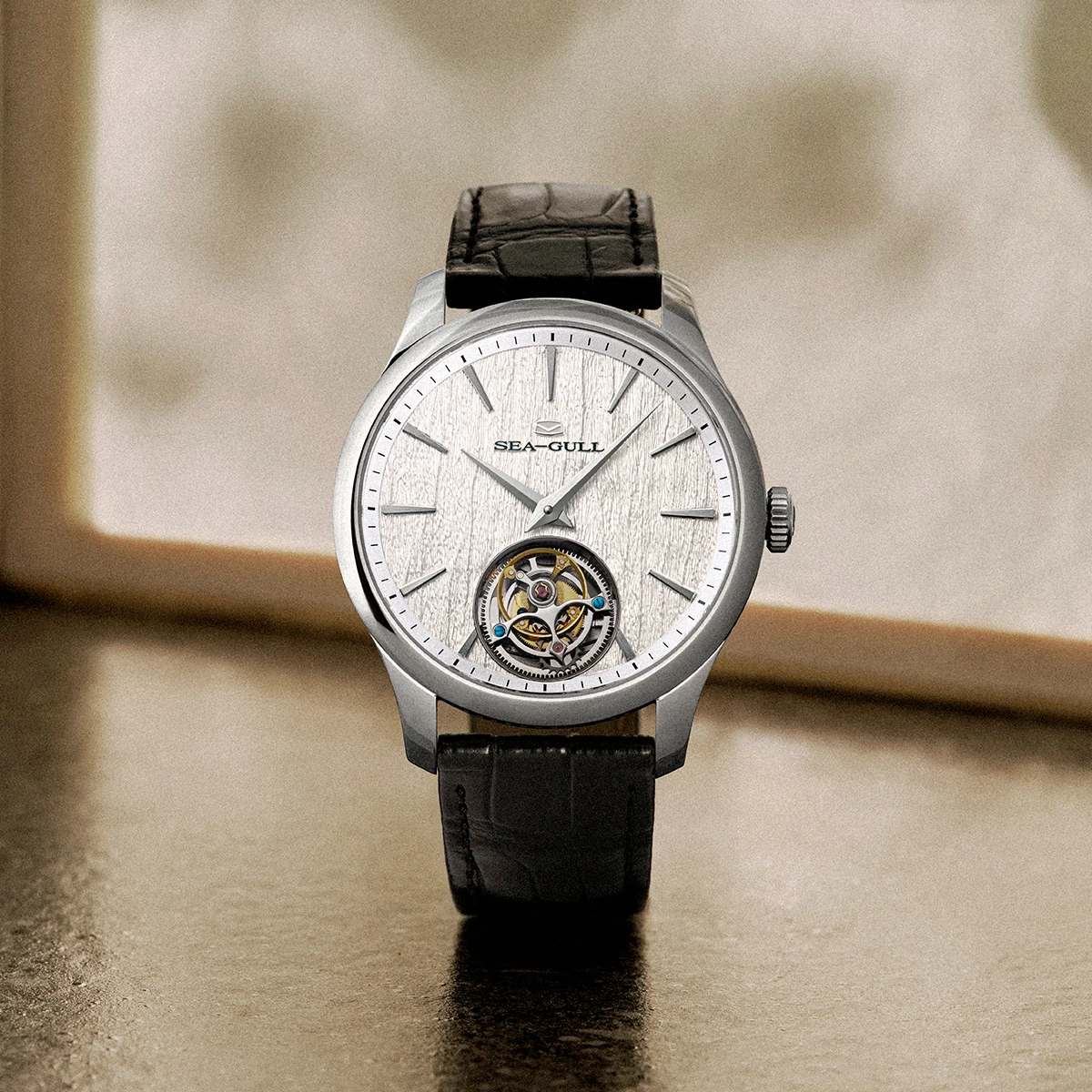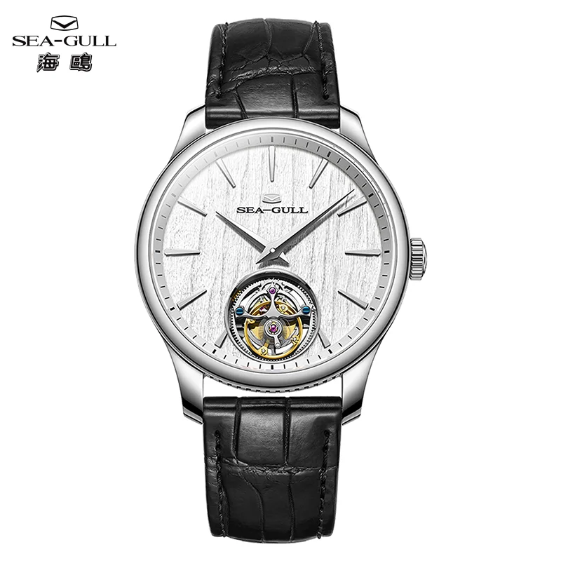 Montre Seagull 70e anniversaire, tourbillon ultra-fin, mouvement ST8610 automatique, boîtier acier inoxydable, cristal de saphir, bracelet cuir.