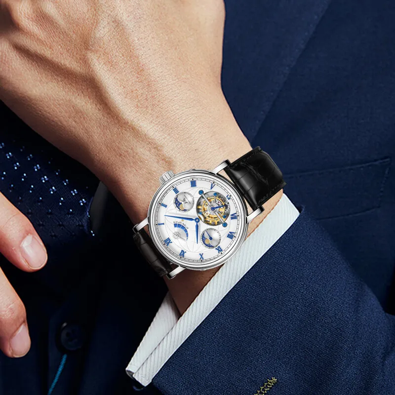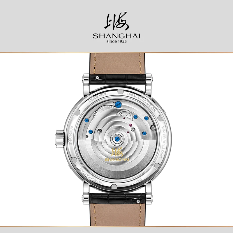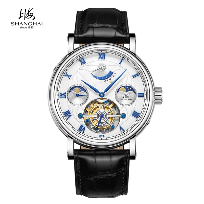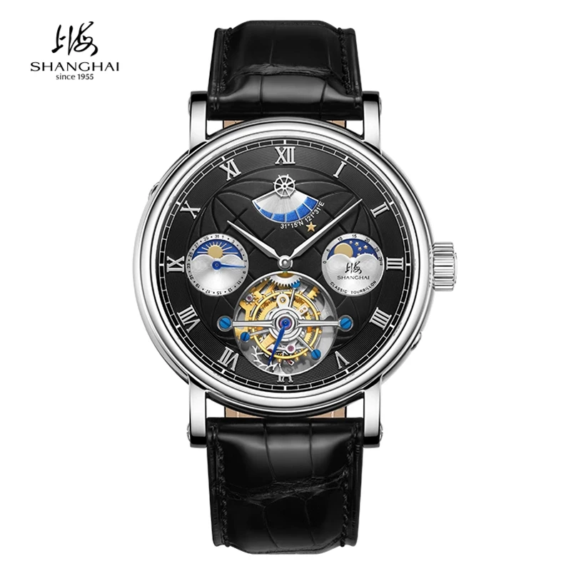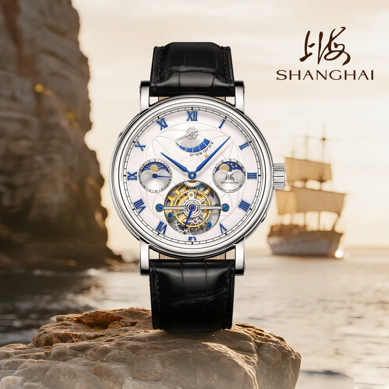 Montre mécanique de luxe Shanghai 43mm avec tourbillon visible, phase de lune, calendrier complet et réserve de marche de 56h. Élégance et précision pour les amateurs d’horlogerie haut de gamme.