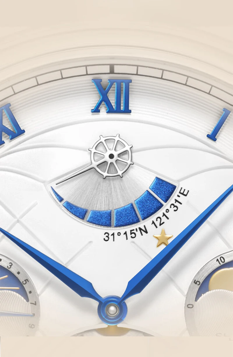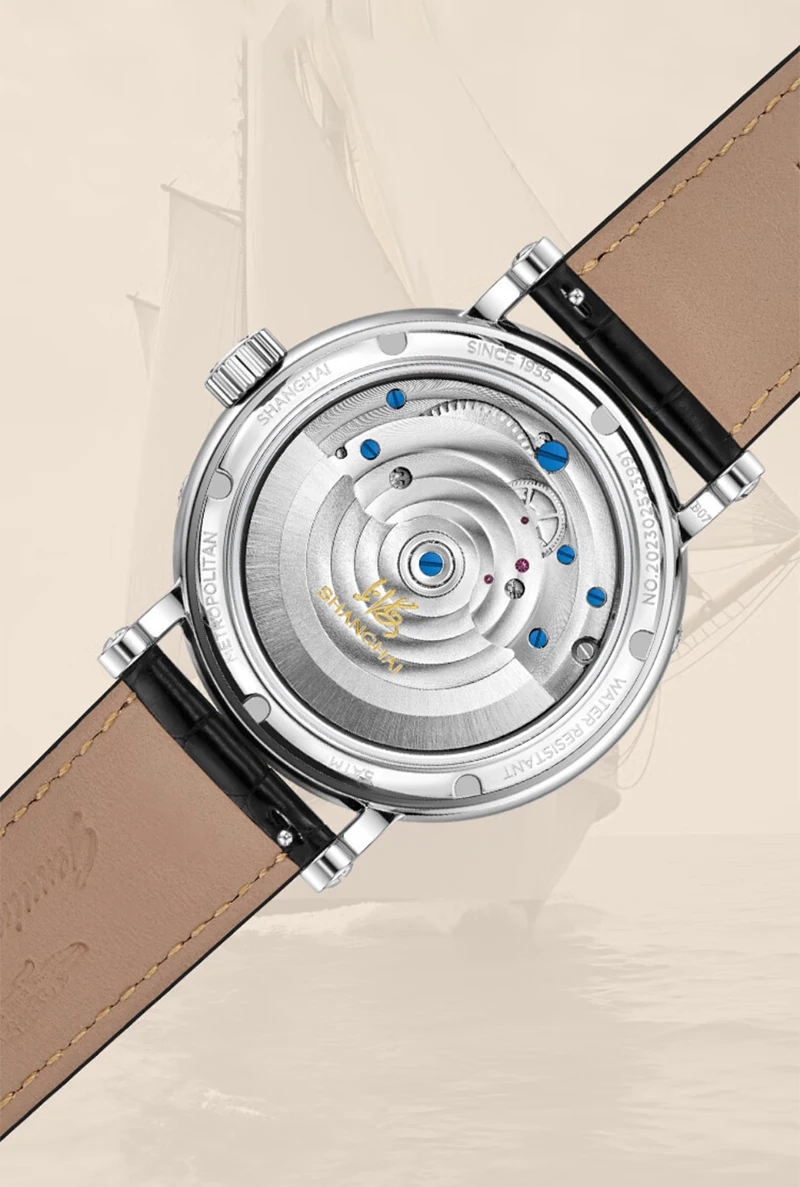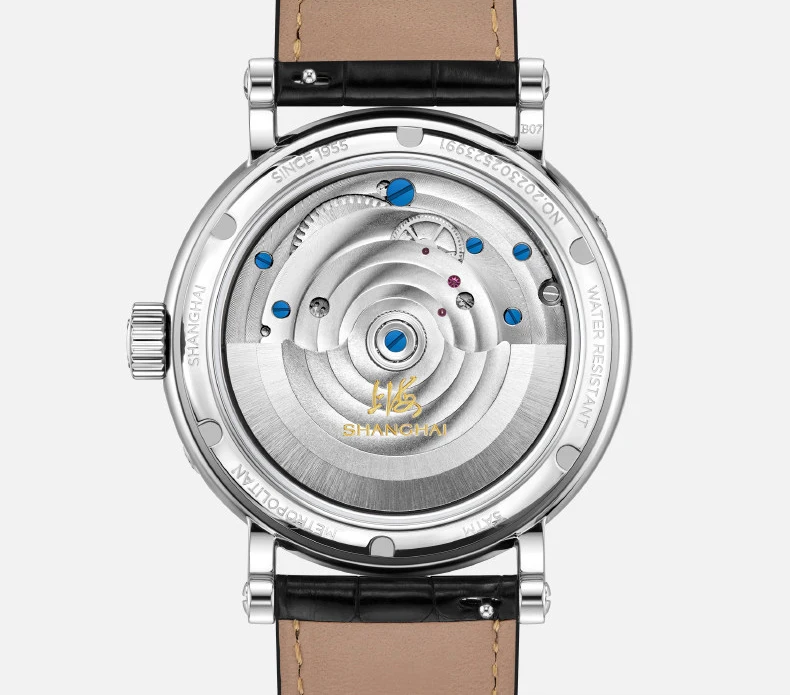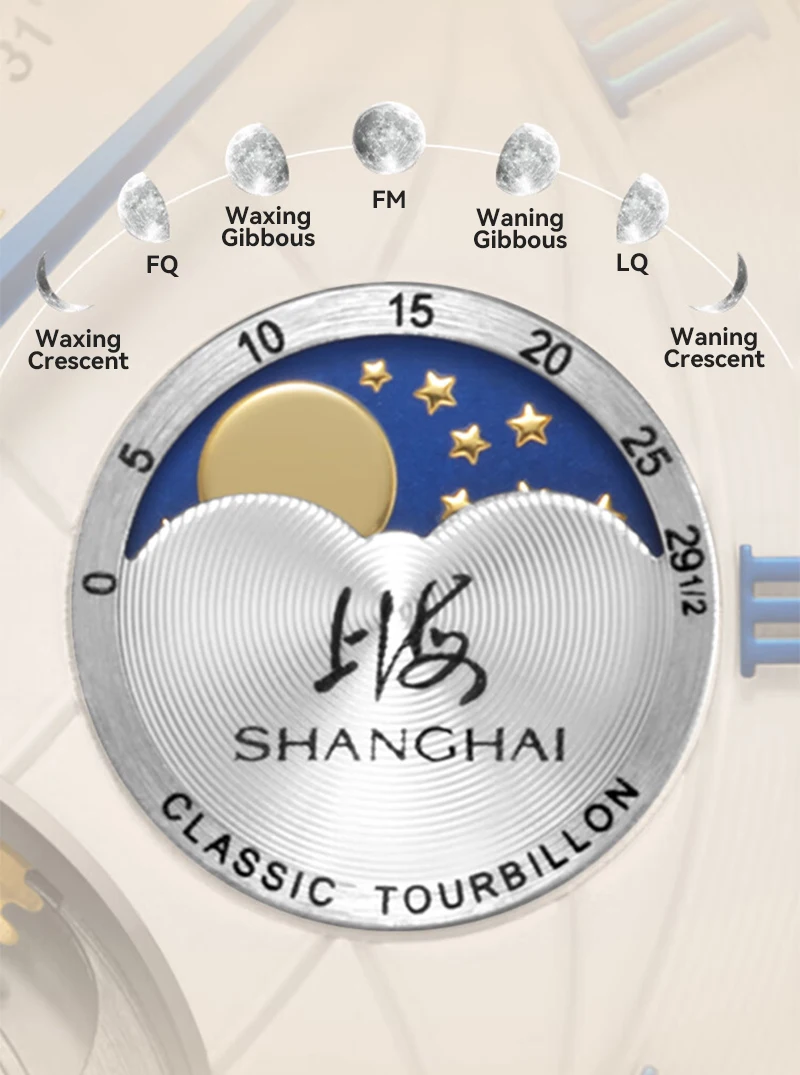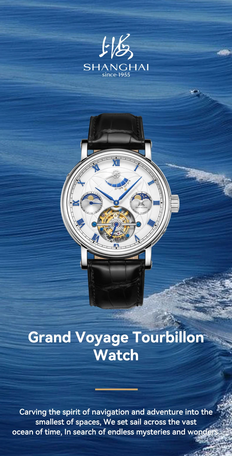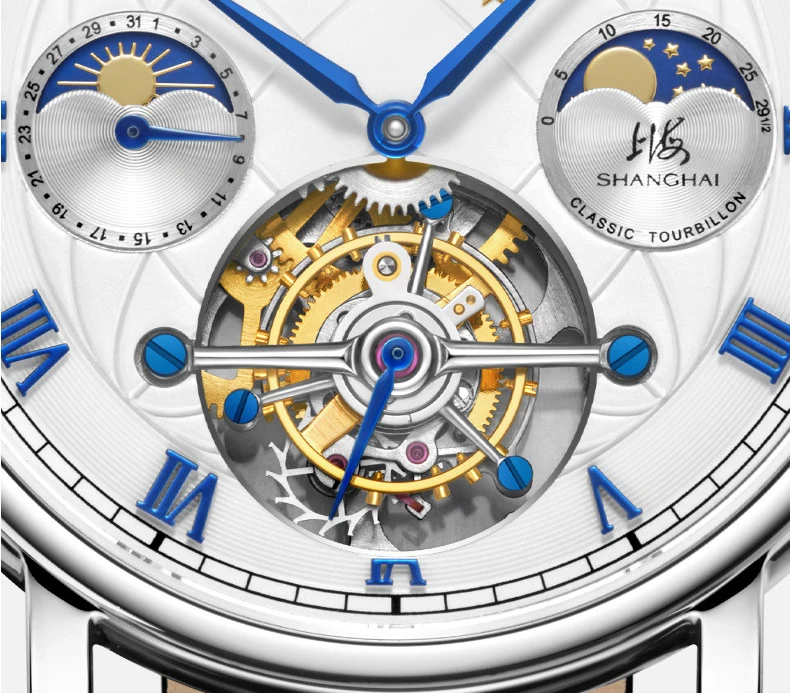 Montre mécanique de luxe Shanghai 43mm avec tourbillon visible, phase de lune, calendrier complet et réserve de marche de 56h. Élégance et précision pour les amateurs d’horlogerie haut de gamme.