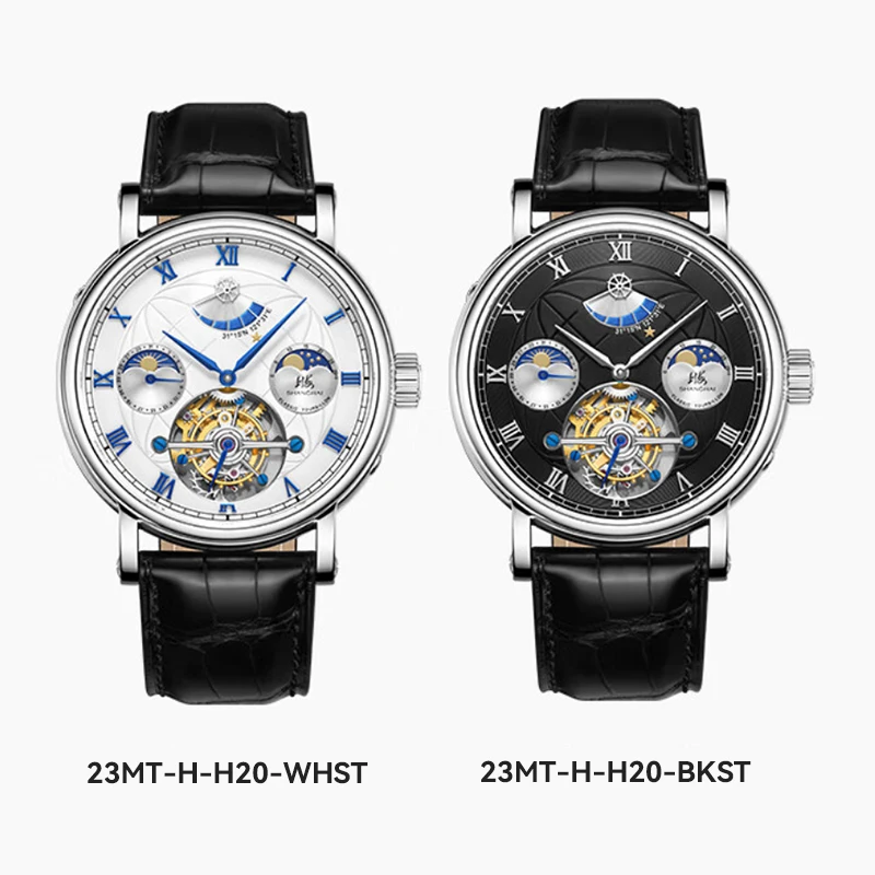 Montre Shanghai Tourbillon Phase de Lune Homme 43mm – Calendrier Complet, Réserve de Marche 56h, Bracelet Cuir de Luxe